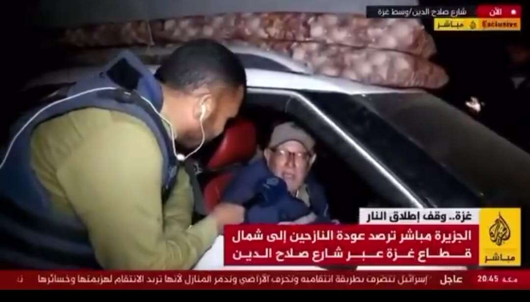 הכתב הציע לעזתי מבוגר באחת המכוניות לאכול משהו "בגלל ההמתנה הארוכה". הוא השיב: "אנחנו לא רוצים אוכל, אנחנו רוצים לחזור לבתים שלנו. (...) לישון במיטה שהגנבים לא לקחו אותה, אלה שחמאס מחזק אותם". אלא שאז הכתב קטע אותו: "יה חאג'". בסרטון אחר שפורסם בערוץ הקטארי אל-ערבי, נשמע אחד העזתים החוזרים לצפון הרצועה מקלל בקללות נמרצות את מנהיג חמאס שחוסל, יחיא סינוואר.