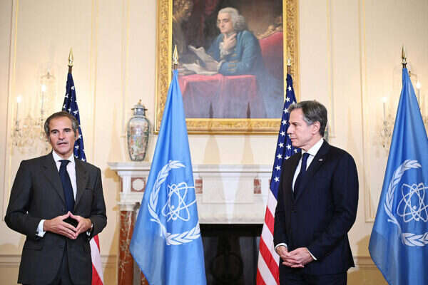 יו"ר סבא"א רפאל גרוסי בפגישה עם מזכיר המדינה אנטוני בלינקן בוושינגטון | צילום: MANDEL NGAN / POOL / AFP