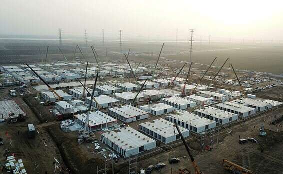 מאות מבני בטון שיוצרו מראש ממלאים את הנוף, שקודם לכן היה שדה חקלאי, מחוץ לעיר שה-ג'יאג'וואנג בצפון-מזרח סין. הבנייה החדשה היא חלק ממתחם בידוד עצום, ככל הנראה הגדול מסוגו בעולם, שבונה הממשלה הסינית במטרה למנוע התפרצות מחודשת של נגיף הקורונה.