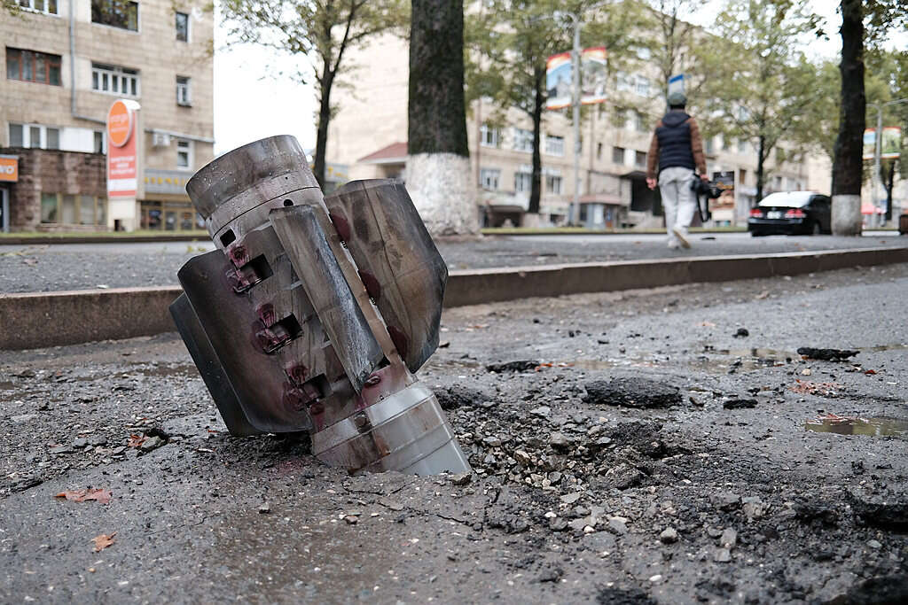 טיל שנחת ולא התפוצץ בבירת חבל נגורנו קרבך // צילום: איי.פי // טיל שנחת ולא התפוצץ בבירת חבל נגורנו קרבך // צילום: איי.פי