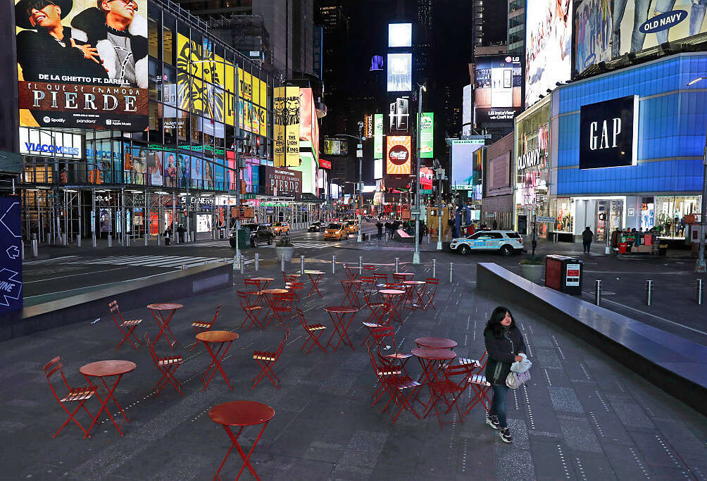 העיר ניו יורק, ובפרט רובע מנהטן, הם מהמקומות הצפופים ביותר בעולם – דבר שהביא להתפרצות מהירה במיוחד של נגיף הקורונה. כיכר טיימס, המקום השוקק ביותר בעיר, ננטשה לחלוטין, ובמקום אלפי אנשים שגודשים אותה בכל שעות היממה, את הכיכר ממלאים כעת כיסאות ריקים של בתי הקפה והמסעדות הסגורים. אף שעדיין לא הוכרז על עוצר רשמי בעיר, כל מקומות הבילוי וההסעדה נסגרו בצו חסר תקדים, וגם מרבית העובדים במגדלי המשרדים הענקיים חדלו מלהגיע לעבודה. המסחר בוול-סטריט עודנו מתנהל, אך הוא הופסק בימים האחרונים מספר פעמים לאחר שהמדדים צנחו והתעורר חשש מקריסה כללית של שוק המניות.