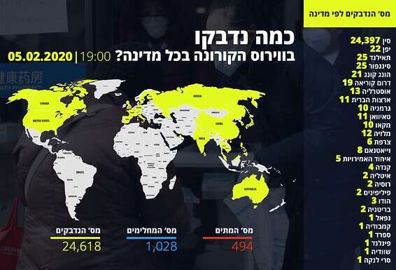 כרגע אומדן הנפגעים הרשמי שפרסמה הממשלה הסינית עומד על 24 אלף נדבקים, 494 מתים, מתוכם שניים מחוץ לסין, ואומדן המחלימים עומד על 1,028.