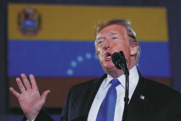 במהלך נאום שנשא במיאמי, לעיני מהגרים רבים מוונצואלה ומקובה, טען הנשיא כי "כמות בלתי נתפסת" של ציוד הומינטרי מעוכבת בגבול והיא "ממתינה לסייע למיליונים". טראמפ למעשה מגביר את הלחץ על מדורו, לאחר שהשית כבר עיצומים על הנשיא.