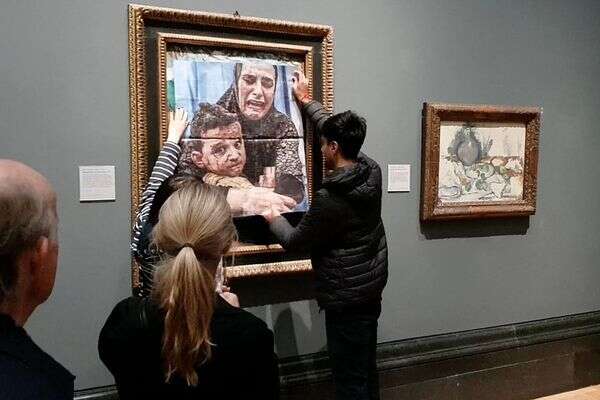 שני פעילים של ארגון Youth Demand הדביקו היום (רביעי) תמונה של אם וילד בעזה על יצירת מופת של פיקאסו בגלריה הלאומית בבריטניה כדי לדרוש אמברגו נשק על ישראל.