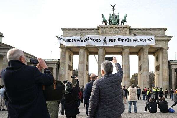 מחאה חריגה בלב הבירה: פעילים פרו פלשתיניים טיפסו היום (חמישי) על שער ברנדנבורג, סמלה האייקוני של בירת גרמניה, שם הניפו שלט: "לעולם לא עוד רצח עם, חופש לפלשתין". הם הניפו דגלי פלשתין והשתמשו באבוקות.