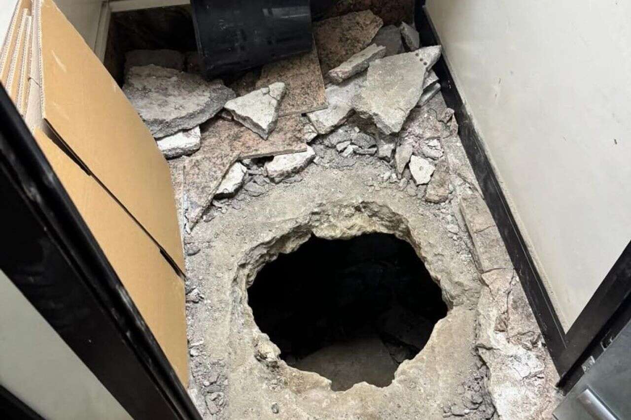 באותה עת, מחדר סמוך לחדר הכספות, יצאו דרך חור ברצפה לפחות שלושה שודדים, ואולי אף שישה, כך לפי הדיווח. החור נקדח מתוך מערכת הביוב העירונית, ב"עבודה קפדנית שנמשכה זמן רב", לשון הדיווח. בסריקות שבוצעו במערכת הביוב הבוקר נמצאו כלי חפירה, מיכלים להוצאת פסולת וגנרטור קטן.