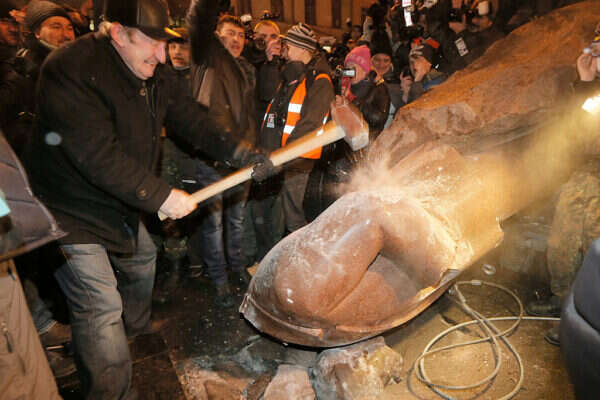 מפגינים מנתצים פסל של לנין באוקראינה | צילום: אי.פי