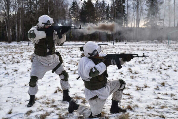 על חוף ימה של מריופול, קילומטרים ספורים בלבד מגבול החזית, אנשי "גדוד אזוב" של כוחות ההגנה של אוקראינה, מיליציה המסייעת לצבא הלאומי של אוקראינה, מתאמנים בנוף המושלג.