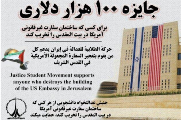 קבוצת סטודנטים איראנית הוציאה כרוז שבו היא קוראת לפוצץ את השגרירות האמריקנית החדשה בירושלים. עוד נכתב בכרוז כי מי שיבצע את אקט הטרור יזכה בתרומה של מאה 100 דולר (מטבע אמריקני למרבה האירוניה) על ידי הארגון.