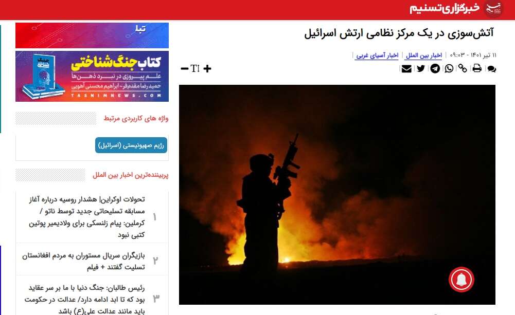 אתר האינטרנט של "תסנים" דיווח בהרחבה על דליקה גדולה בבסיס צבאי בישראל • האירוע התברר כשריפה במפעל פלשתיני למכשירי חשמל • הדיווח כנראה פורסם בתגובה לחשיפה על פיצוץ בבסיס משמרות המהפכה סמוך לטהרן