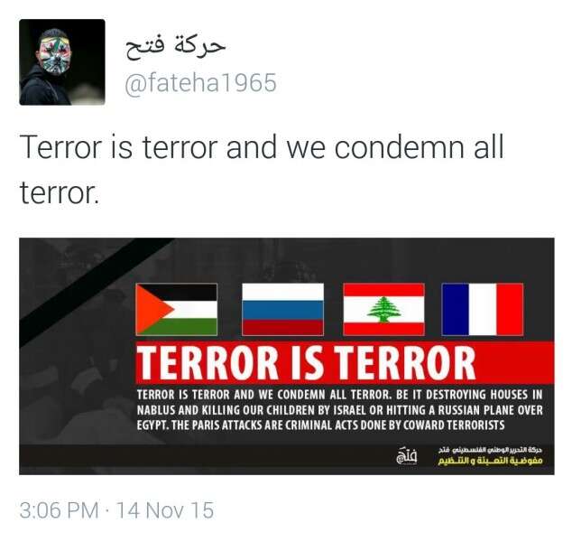 מדברים בשני קולות. הרשות הפלשתינית ותנועת הפתח נגד טרור? תלוי באיזו שפה אתם קוראים, ואיזה חלק בפוסט. בחשבונות הרשמיים של הרשות ותנועת פתח ברשתות החברתיות, מפורסמות מאז הפיגועים בפאריס, הודעות באנגלית תחת הכותרת "טרור הוא טרור".