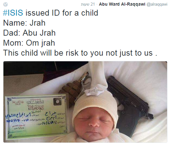 תמונת תעמולה מחליאה, הנקשרת בארגון הטרור של "המדינה האיסלאמית" מסעירה את הרשתות החברתיות. אל חשבון טוויטר המזוהה עם תומך המדינה, הועלתה תמונה ובה תינוק בן יומו ישן לצד רימון, רובה, ומה שנראה כמו תעודת לידה.