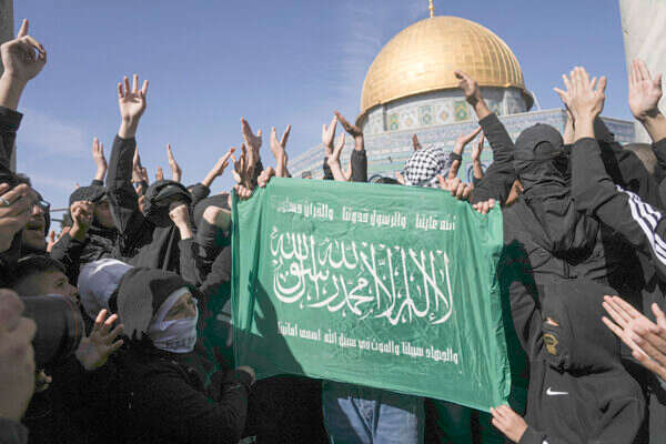 רעולי פנים עם דגל חמאס בהר הבית (ארכיון) | צילום: AP