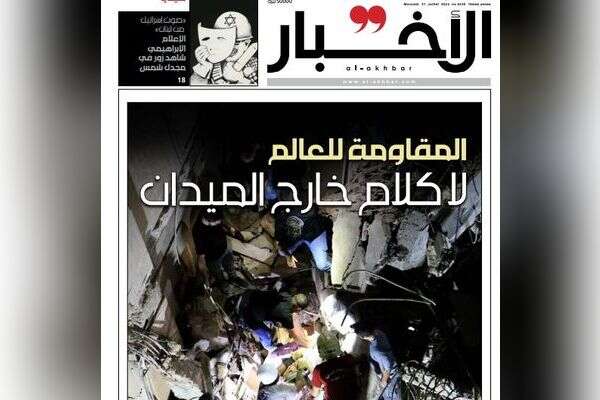 אחרי חיסול "רמטכ"ל חיזבאללה" פואד מוחסן: שער העיתון "אל-אחבאר" המקורב לחיזבאללה פרסם הבוקר (רביעי) את הכותרת: "ההתנגדות לעולם - אין דיבורים מחוץ לשטח". עוד הודגש כי "ברור שמדובר בשלב חדש בעימות".
