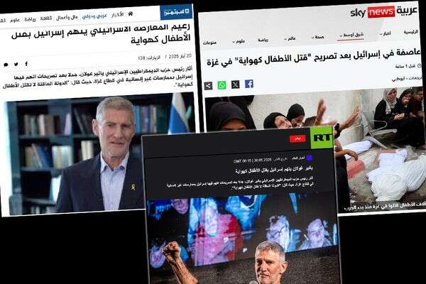 הצהרותיו החריפות של יאיר גולן, יו"ר מפלגת הדמוקרטים, עוררו הבוקר (שלישי) סערה נרחבת גם בתקשורת הערבית. גולן אמר בריאיון לרדיו "כאן רשת ב'" כי "מדינה שפויה לא הורגת ילדים כתחביב", והזהיר שישראל עלולה להפוך ל"מדינה מנודה בין האומות", בדומה לדרום אפריקה בתקופת האפרטהייד. לדבריו, הממשלה הנוכחית "מלאה באנשים מונעי נקמה, חסרי מוסר וחסרי יכולת", ומהווה איום של ממש על עצם קיומה של המדינה.