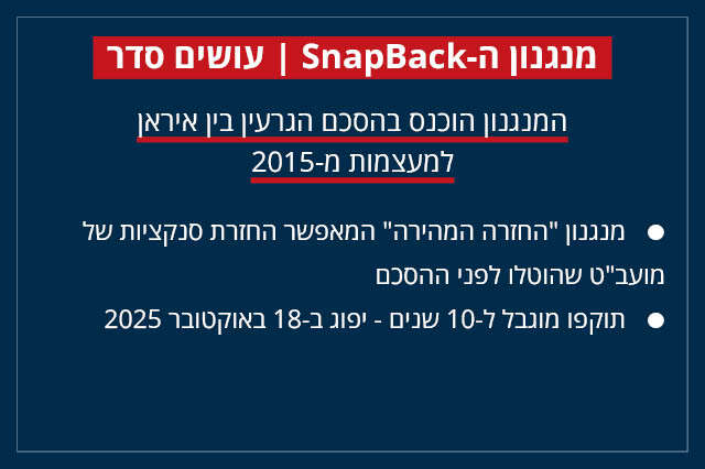 לפי הדיווחים השונים היוצאים מפריז, ברלין ולונדון, נראה כי הפעלת מנגנון הסנאפבק להחזרת כלל הסנקציות שהוסרו מעל איראן בעקבות הסכם הגרעין ב-2015 היא צעד (כמעט) בלתי נמנע וצריך לקרות משהו יוצא דופן כדי שמהלך זה יידחה או יבוטל.