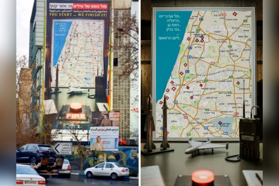 טהרן מקשיחה את הטון ובאחת הכיכרות בעיר, כיכר פלשתין, נתלה היום (ראשון) שלט חדש שמאיים על אזור המרכז בישראל: "מול גשם של טילים, זה אזור קטן!" נכתב בצבעים בוהקים.