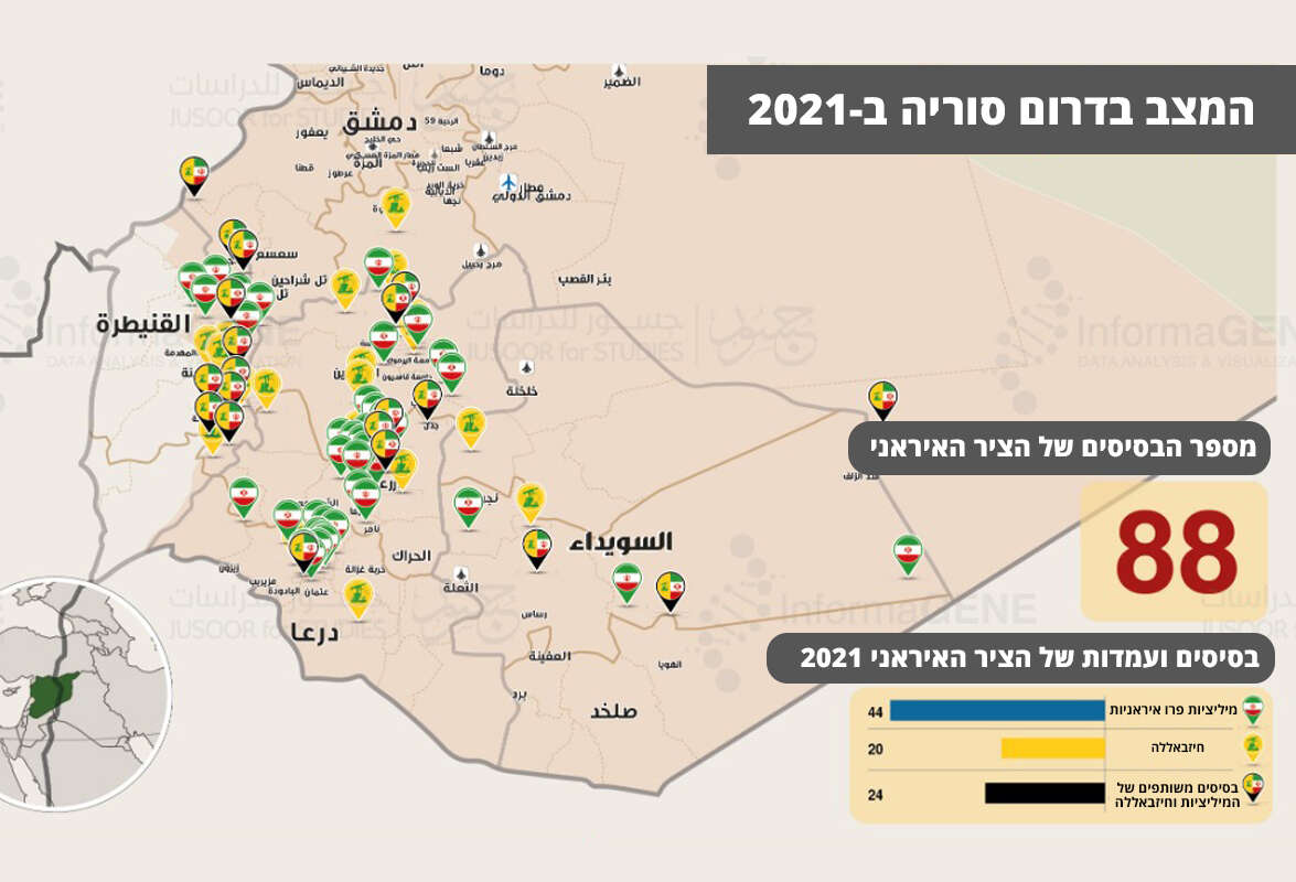הדו"ח טוען כי כמות העמדות הצבאיות והבסיסים של המיליציות הפרו איראניות וארגון הטרור חיזבאללה עלה בין השנים 2018 ו-2021 מ-40 ל-88. עוד נחשף כי בסיסים של הצבא הסורי, במיוחד חטיבה 90 הפרוסה מדרום לבירה דמשק, משמשים עורף לוגיסטי עבור אנשי המיליציה הפרו איראניות.