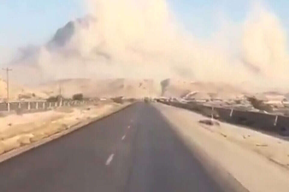 Dust rising from the hills and lorries swaying during the 6.3 Earthquake in #Iran near Bandar Abbas in the last hour. pic.twitter.com/sgaNYeugjR