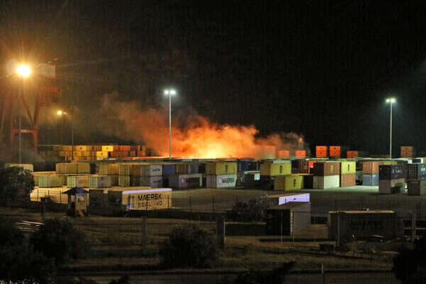 ארה"ב הוצגה ככלי ריק. מכולות עולות באש לאחר הפצצה בעיר הנמל לטקיה // צילום: אי.אף.פי