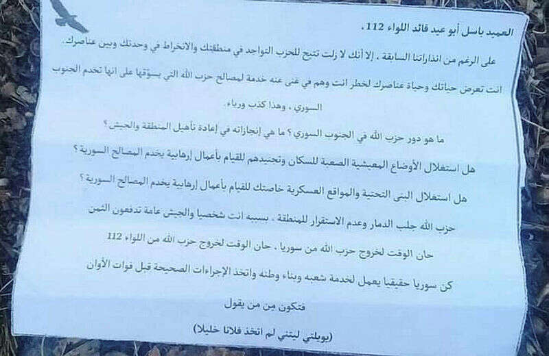 במכתב שפנה למפקד חטיבה 112 בצבא הסורי, באסל אבו עיד, נאמר כי למרות אזהרות קודמות, הוא עדיין מאפשר לחיזבאללה להימצא באזור שתחת פיקודו. "אתה שם את חייך ואת חיי אנשיך בסכנה בגלל שירות האינטרס של חיזבאללה בדרום סוריה", הודגש.