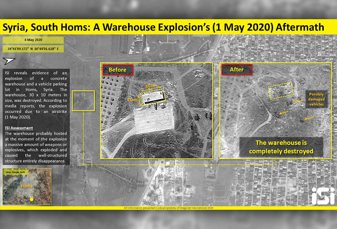 חברת המודיעין הישראלית אימאג׳ סאט (ImageSat International - ISI), פרסמה היום (שלישי) צילום לוויין של המבנה בחומס שהותקף על פי פרסומים זרים על ידי חיל האוויר הישראלי, ב-1 במאי. בתמונה ניתן לראות כי המבנה שהותקף, מחסן כלי רכב, נמחק כליל.