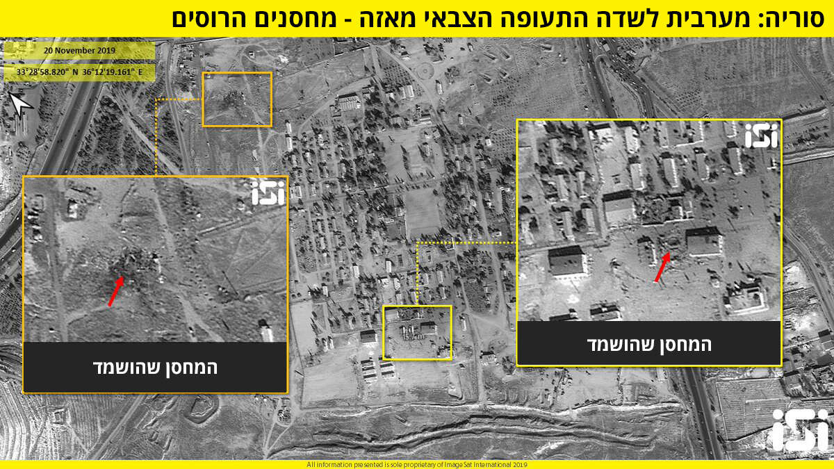 בתמונות שפורסמו, נראים שני מחסנים שככל הנראה שימשו את כוח קודס האיראני לפני התקיפה ואחריה כשהם מושמדים לחלוטין. המחסנים שהותקפו ב-20 בנובמבר, היו ממוקמים בתוך מחנה צבאי הממוקם על יד שדה התעופה הצבאי מאזה, מערבית לדמשק.