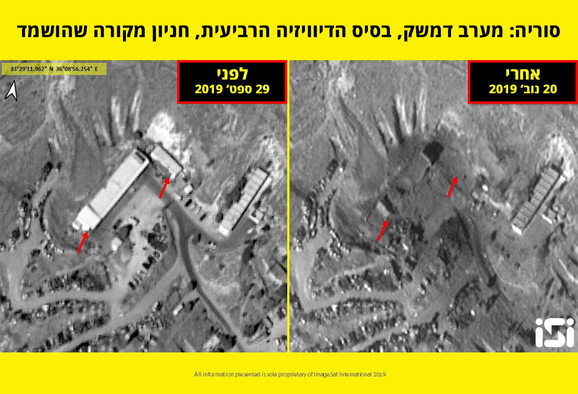 תמונות הלוויין שפורסמו מראות על הרס נרחב בתוך בסיס של הדיוויזיה הרביעית, עוצבת העילית המשוריינת של כוחות השמטר בסוריה, מערבית לבירה דמשק.