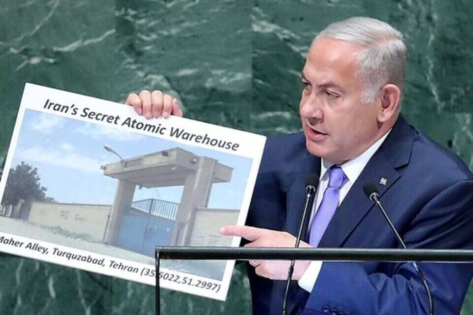 נתניהו חושף את מחסן הגרעין האיראני, ספטמבר 2018 // צילום: רויטרס