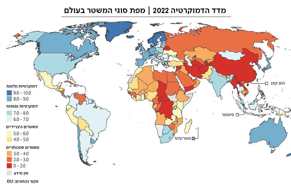 דמוקרטיה תחת מתקפה עולמית: מדד הדמוקרטיה השנתי של מכון המחקר של ה"אקונומיסט" הבריטי הוריד את הדרוג של ישראל בשישה מקומות, בדו"ח שכלל בעיקר בשורות רעות עבור מצב הדמוקרטיה ברחבי העולם.