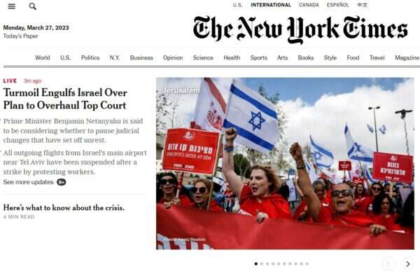 גם בעיתונות המסורתית בארצות הברית זכתה המחאה להיות במוקד העניין הציבורי. עמוד הבית של ה"ניו יורק טיימס" הובל על ידי סיקור המחאה. המחאה כונתה "משבר" והודגש כי הלחץ על נתניהו לקבל החלטה בנוגע לחקיקה הולך וגובר.