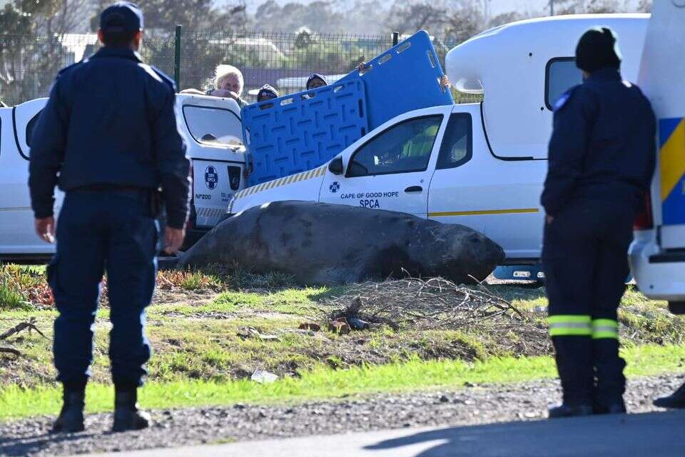 דרום אפריקה: פיל ים "מחבק" ניידת משטרה // צילום: Cape of Good Hope SPCA