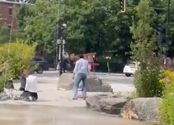 בסרטון המתעד את התקיפה, נראה התוקף רוכן מעל הקורבן, שהיה בלבוש בעל סממנים יהודים ברורים, ומכה אותו שוב ושוב. לאחר מכן, התוקף אסף את חפציו והשליך את הכיפה של הקורבן למזרקה סמוכה.