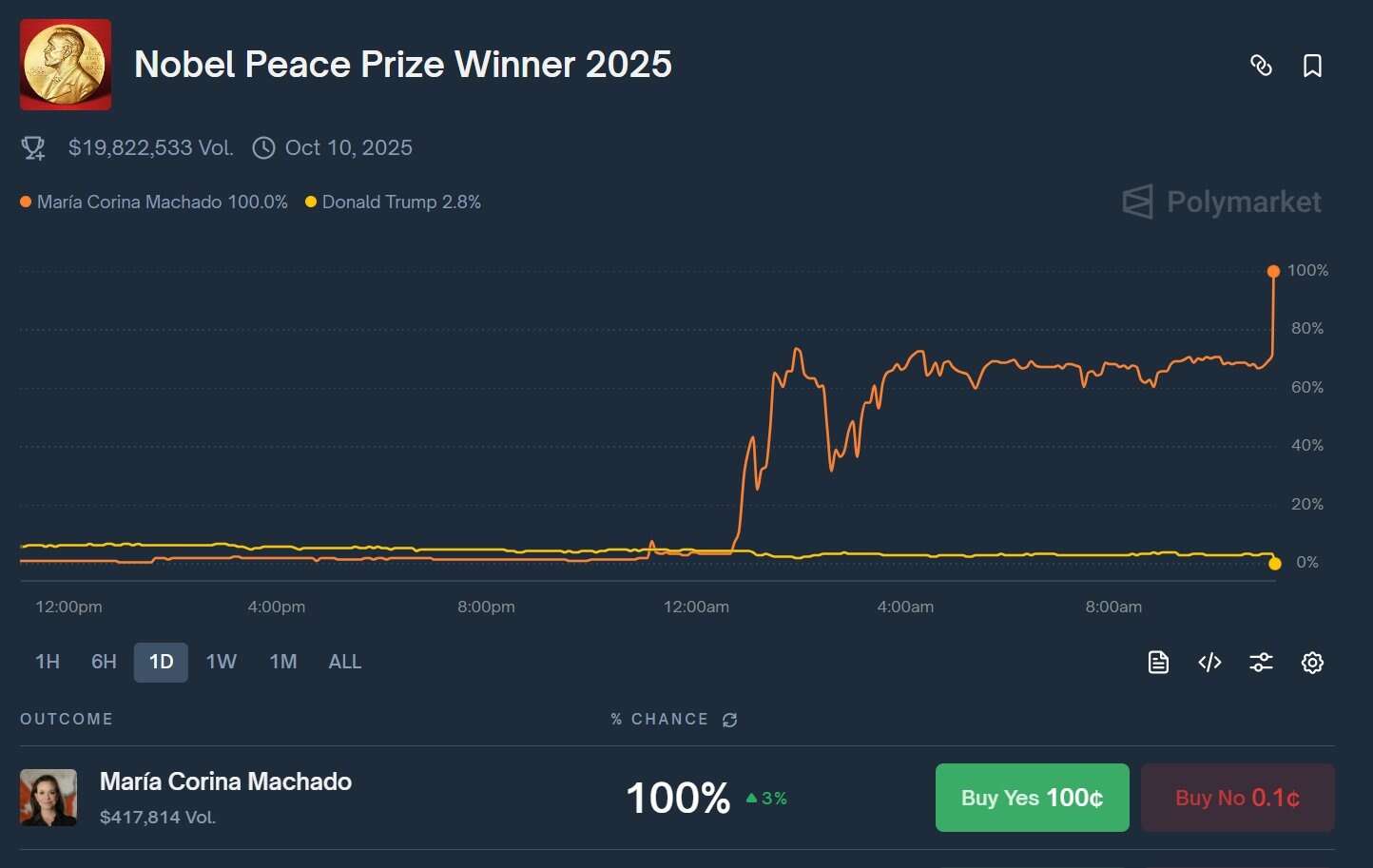 במקביל להכרזה על זכייתה של מריה קורינה מצ׳אדו פרצה שערוריה בנורבגיה בעקבות תנועות חשודות בפלטפורמת הניבויים והתחזיות ״פולימרקט״. ההימורים על זכייתה של מצ׳אדו זינקו זמן קצר לאחר חצות לפי שעון נורבגיה, כשסיכויי הניצחון שלה קפצו מ-3% ל-60%, שעות ספורות לפני ההכרזה הרשמית.