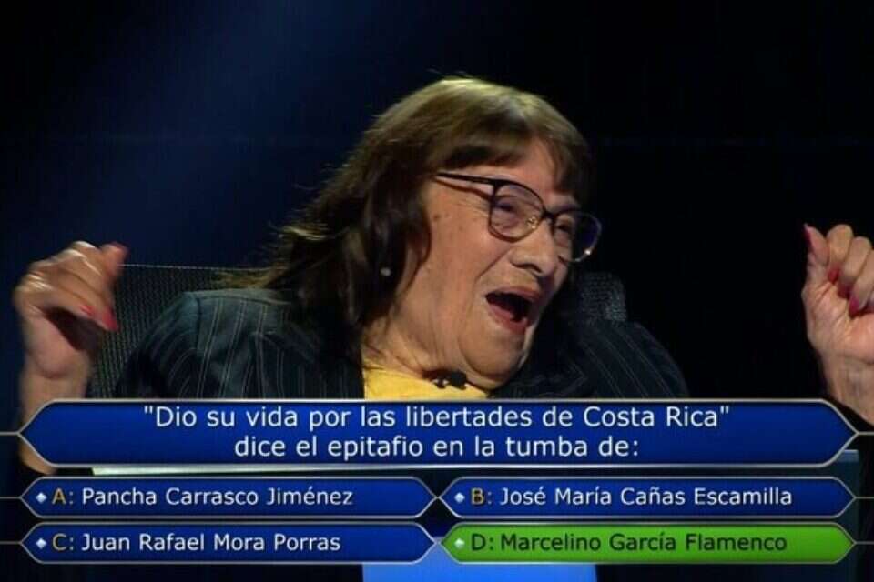 צופי התוכנית "מי רוצה להיות מיליונר" בערוץ 7 הממלכתי בקוסטה ריקה קיבלו הופעה של פעם בחיים כשאישה בת 89 הדהימה את הקהל ולא רק הפגינה ידענות מופלגת אלא גם זכתה בפרס הגדול בשעשועון הטריוויה.