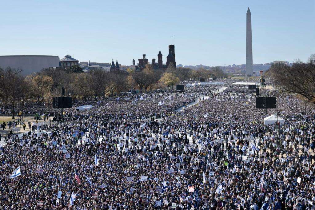 וושינגטון נצבעה בכחול לבן באירוע בקנה מידה היסטורי: עצרת תמיכה ענקית בישראל התקיימה הערב (שלישי) בוושינגטון הבירה. כ-290 אלף בני אדם הגיעו סמוך לבית הלבן - הכינוס היהודי הגדול בתולדות ארה"ב. נשיא המדינה יצחק הרצוג נשא נאום מוקלט.