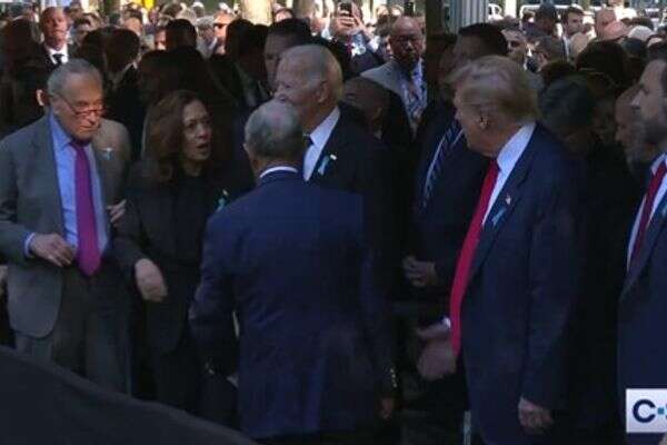 בתיעוד נראים האריס וטראמפ לוחצים ידיים ומחליפים כמה מילים ביניהם. האריס ניצבה בין הנשיא ג'ו ביידן ומנהיג הרוב הדמוקרטי בסנאט צ'אק שומר. טראמפ עמד בין מספר 2 שלו במרוץ, ג'יי די ואנס, לבין בלומברג.