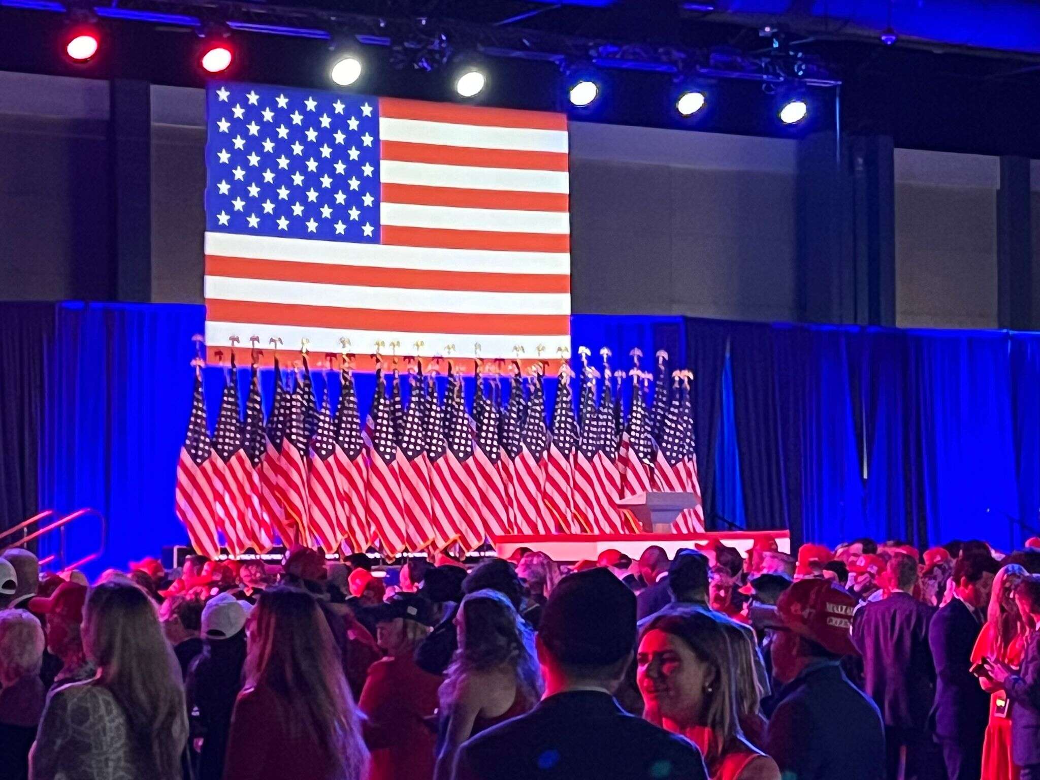 עם זרימת תוצאות האמת של הבחירות לנשיאות ארה״ב והפער שטראמפ מתחיל לצבור על האריס, עוד ועוד אנשים זורמים היום (רביעי) לארנה של ווסט פאלם ביץ׳. נשים בשמלות אדומות, צבעה של המפלגה הרפובליקנית, וגברים בכובעי MAGA ממלאים את האולם. אפילו ילדים קטנים ותינוקות יש בקהל. עד כדי כך הציפיות והתקוות בשמים.