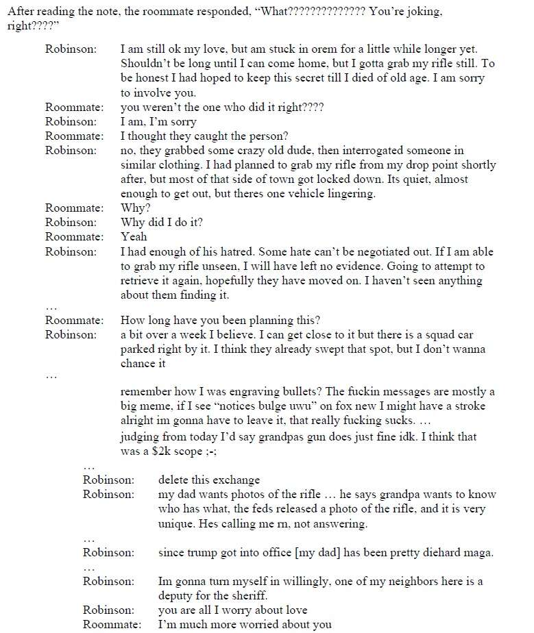 על פי מסמכי בית המשפט, בחילופי הודעות ביניהם, כאשר שותפתו קראה את ההודעה שלו היא שלחה לו בהלם ״מה?????????? אתה צוחק, נכון????״, רובינסון השיב: ״אני עדיין בסדר אהובה. לא אמור לקחת הרבה זמן עד שאחזור הביתה, אבל אני צריך קודם ללכת לקחת את הרובה שלי. בכנות קיוויתי לשמור על הסוד הזה עד שאמות בשיבה טובה״. כשבת זוגו שאלה ״אתה לא זה שעשה את זה נכון????״, השיב ״זה אני. אני מצטער״. רובינסון הסביר כי ״נמאס לי מהשנאה שלו. יש שנאה שאי אפשר לנהל דיון עליה״ והודה שתכנן את הרצח ״קצת יותר משבוע״.