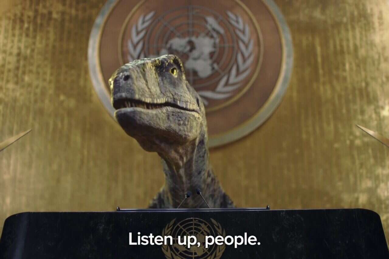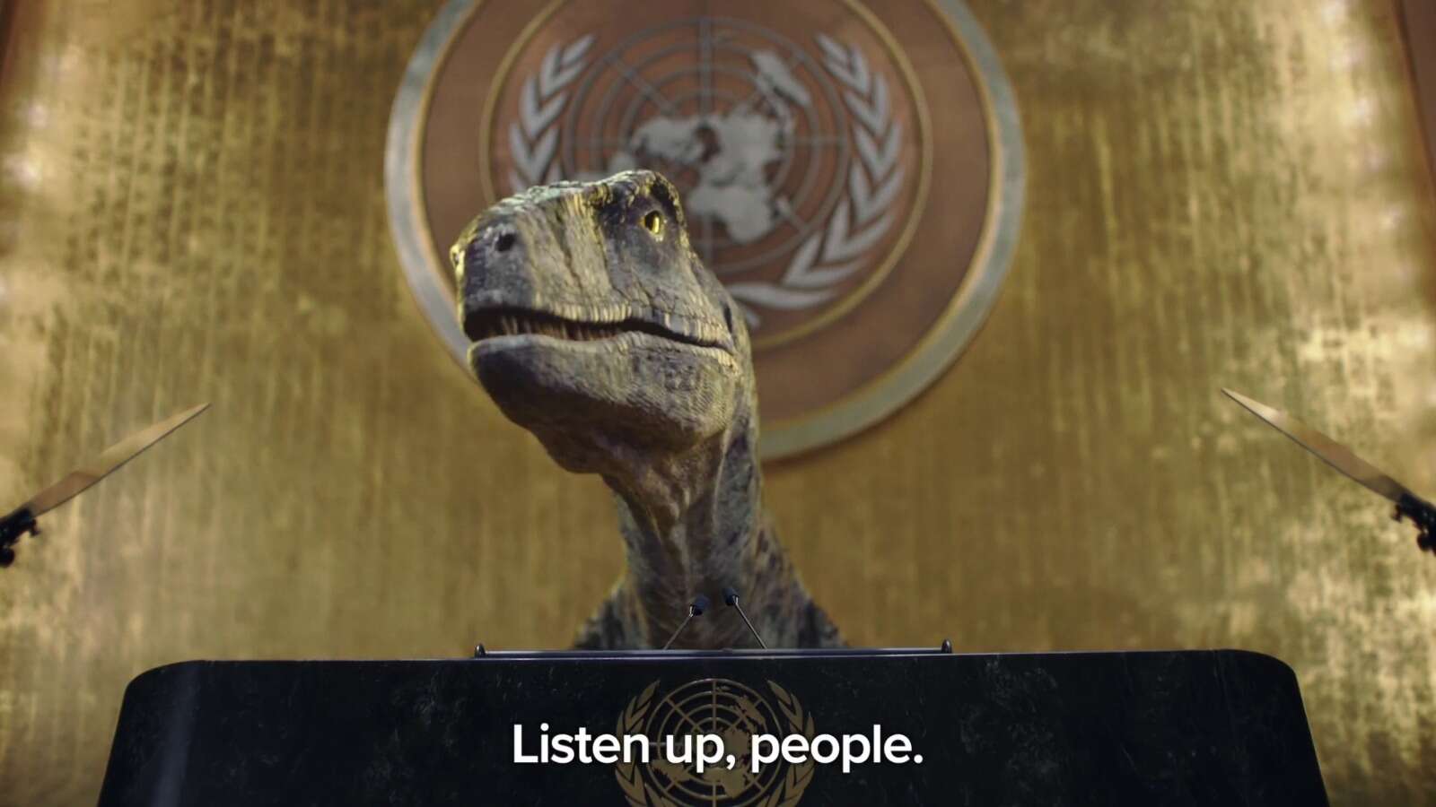 "הגיע הזמן שבני האדם יפסיקו להמציא תירוצים ויתחילו לעשות שינויים", אומר הדינוזאור פרנקי לדיפלומטים בעצרת. "לפחות היה לנו אסטרואיד, מה התירוץ שלכם?", ממשיך הדינוזאור כשהוא מזהיר מפני העתיד לבוא על כדור הארץ.
