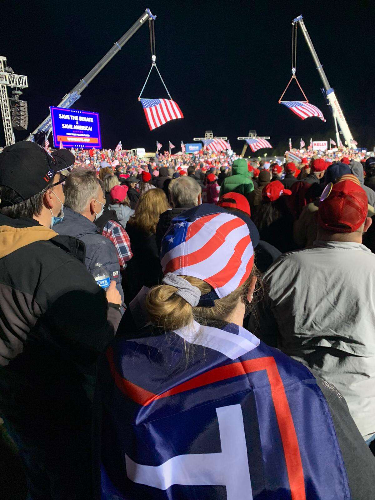 טראמפ האב נחת במסוק ב-21:30 בשדה התעופה הקטן, כולם צילמו אותו נוחת כמו כוכב על. היה גם גיוון בקהל - מכל הגילאים ומכל הסוגים, כולל כמה אזרחים שחורים. טראמפ, כמו בקמפיין לנשיאות, הגיע הפעם כדי לערוך עצרת ענק שתלהיב את הבייס ותעשה את ההבדל בקרב הצמוד על שני מושבי הסנאט של המדינה הדרומית.
