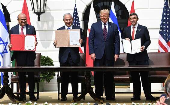 חתימה על הסכמי השלום בין ישראל לאיחוד האמירויות ובחריין // צילום: איי.אף.פי // חתימה על הסכמי השלום בין ישראל לאיחוד האמירויות ובחריין