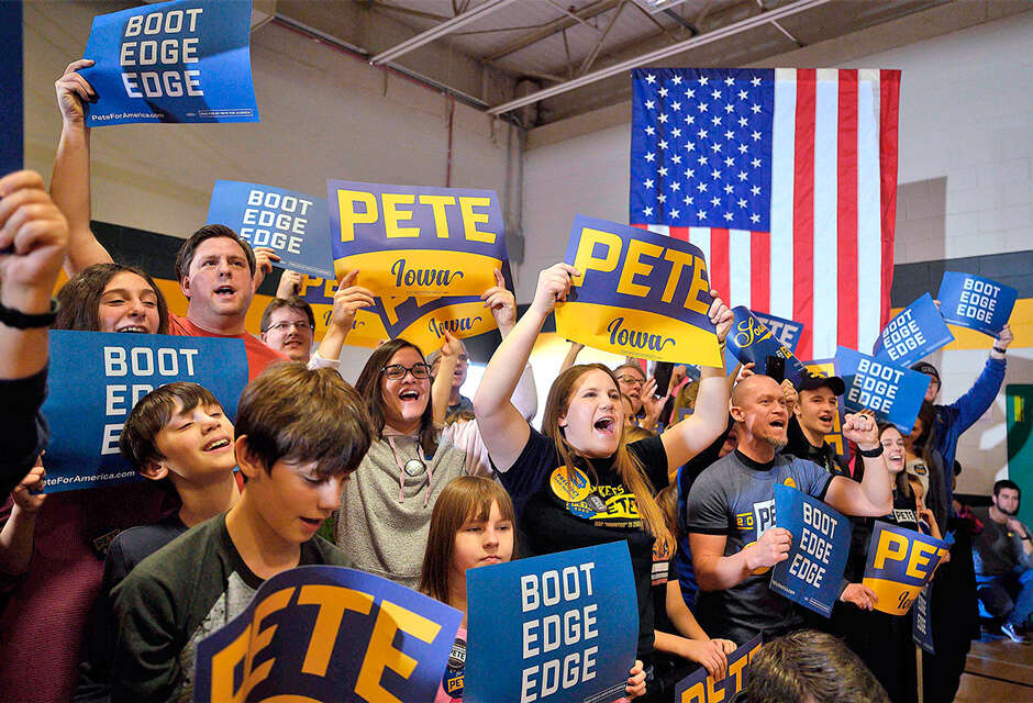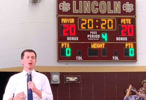 פיט בוטיג'ג' הוא אולי המועמד הכי מעניין במרוץ - בגלל היותו ראש עיר לשעבר, השירות הצבאי שלו באפגניסטן, והיותו הומו מוצהר ובן 38 - והעצרת שלו אתמול, היתה גם האירוע הכי המוני והכי אנרגטי שראיתי עד כה. זה היה באולם ספורט של בית ספר תיכון "לינקולן" בדה מוין.