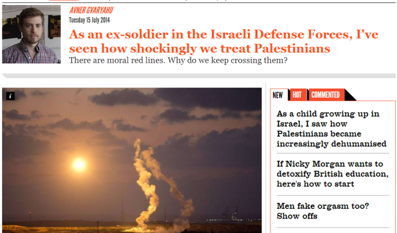 ביום שלישי השבוע (15 ביולי), בזמן שכוחותינו נלחמו מול מחבלי עזה ואזרחינו רצו למקלטים מפני טילים ששיגר האויב, קיבלנו טיל ישיר מאחד (מיני רבים) מעיתוני השמאל האנטי ישראלי בעולם, במקרה הזה, "האינדיפנדנט" הבריטי. מה שמעניין הוא מי ירה את הטיל ישירות אלינו: אבנר גבריהו מארגון "שוברים שתיקה".