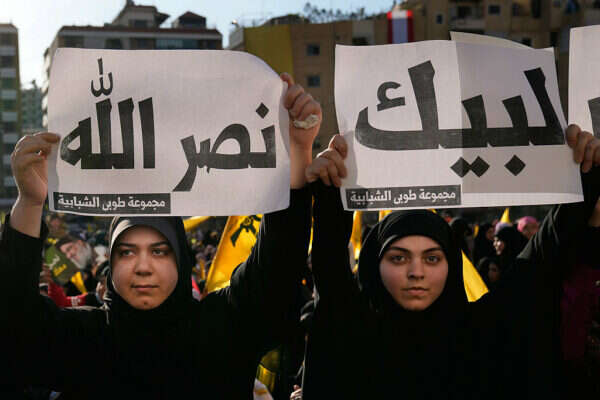 תומכות חיזבאללה נושאות שלטים בעד נסראללה בביירות. הבחירות ביום ראשון | צילום: אי.פי