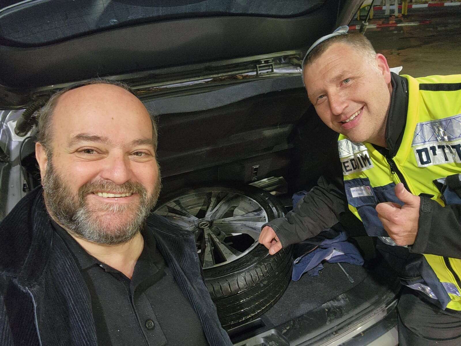 ואני מדשדש לאיטי, עוקף את הפנייה לירושלים ומצליח להגיע, לאט־לאט, אל תחנת הדלק בלטרון. כמו שוטה אני מנסה לנפח בגשם מטורף את הגלגל הנקור, שכולו מושחת וקרוע, ורק אז נזכר שיש "ידידים"! ידידים הוא הארגון הישראלי המתוק ביותר במרחב, שמסייע לנהגים תקועים ונקורים בכל מקום או מצב, בחינם וללא תמורה. אני מחייג לידידים, ולוקחים ממני כתובת, ובאותו רגע נופל החשמל בתחנת הדלק, ואני נותר לעמוד בליבה של עלטה. דממה מסביב, כי יצורי האנוש היחידים המצויים בסביבה הם נזירי מנזר השתקנים. ולפתע, מתוך החשיכה העבה, מבצבצים שני פנסים ורכב מתקרב אלי, עוצר על ידי, ומתוכו קופץ בועז בורובסקי בכבודו ובעצמו, שמסתבר שהוא־הוא מתנדב ידידים שקיבל את הקריאה. וכשהוא רואה שזה אני, הוא נותן צעקה שכמעט החזירה את החשמל לתחנה החשוכה: