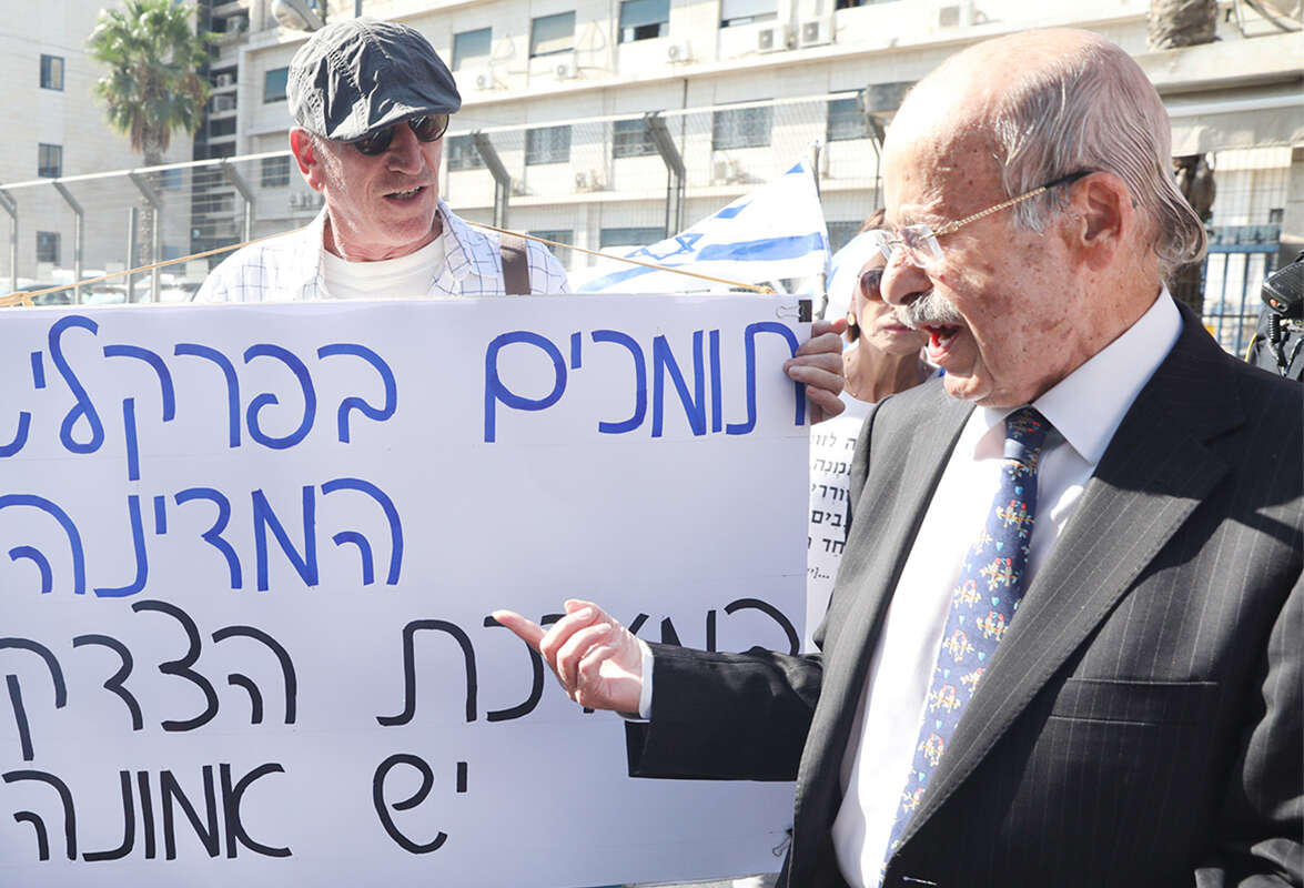 ייתכן שנעלמה פרשנות שונה בתכלית. עו"ד רם כספי, פרקליטו של רה"מ נתניהו, לצד מפגין ליד משרד המשפטים בירושלים // צילום: מרים צחי