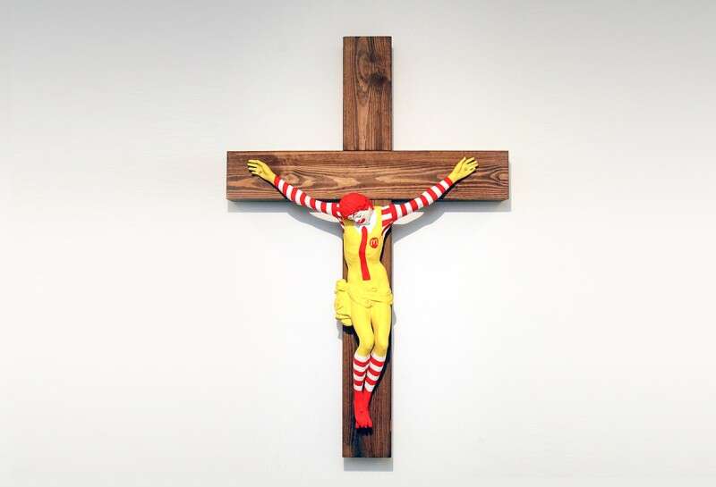 מוזיאון בחיפה מציג יצירה שלועגת לישו: דמות הפסל של מקדונלד'ס על הצלב. יש לנו ממסד אמנותי מאוד אמיץ: הם לא מעזים ללעוג לאסלאם, יש להם אומץ לתקוע בעכוז דגל ישראל, אבל אין להם מספיק אומץ לעשות את זה לדגל פלשתיני.