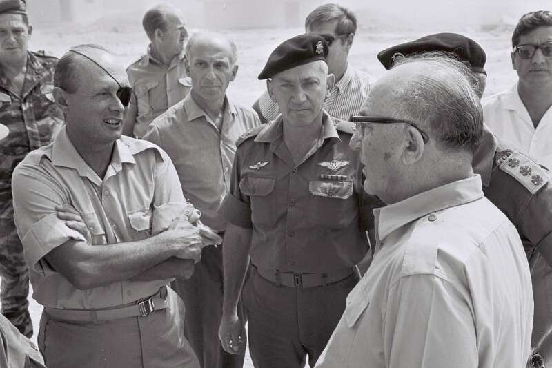 נתקעו בבוץ. בר־לב (במרכז), אשכול (מימין) ודיין, 1968 // צילום: אילן ברונר