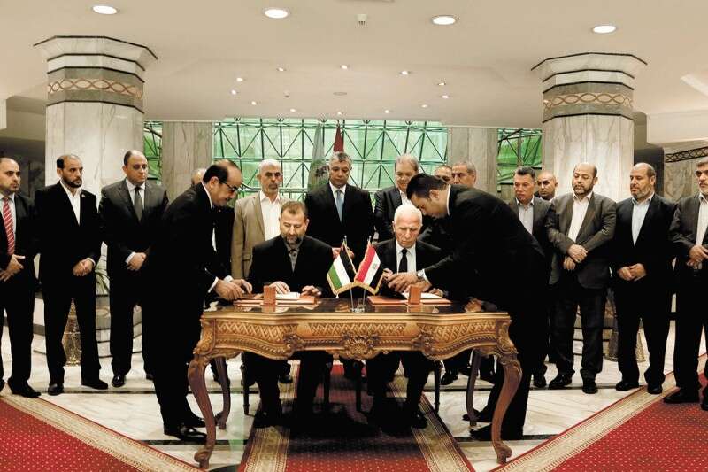 האם מחמוד עבאס יסיג את חמאס מדרכו האלימה? חתימת הסכם הפיוס בין פת"ח לחמאס // צילום: אי.פי